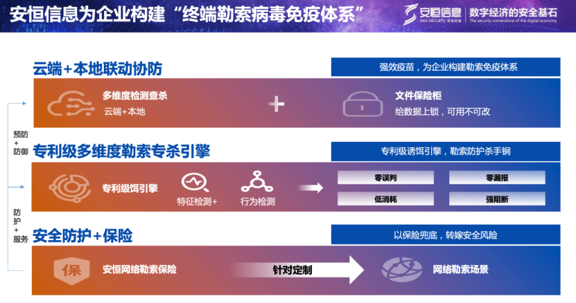 2021年4月安恒EDR推出“勒索病毒口罩&疫苗”创新解决方案以及防勒索U盘。该方案围绕数据防勒索为目标,以资产为中心构建了勒索风险处置闭环,包括、监测、预防、防御、响应、溯源、加固6大阶段,包含多项核心技术专利。“防勒索疫苗”方案一经推出,立刻引发了行业震动,在勒索攻击愈发猖狂的形势下犹如给广大的企事业客户注射了一支强心剂。