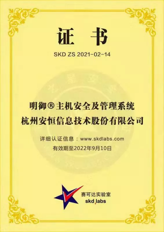 2021年9月30日安恒EDR在测试中凭借在病毒防护及勒索病毒防护等多方面优异的表现,顺利通过国际知名第三方网络信息安全测评认证机构赛可达实验室认证,被授予 “东方之星”证书(SKD ZS2021-02-14),本次获奖证明了安恒EDR已经具备国际水平。