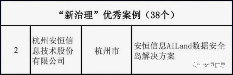 其中,“新技术”聚焦人工智能、大数据、云计算、区块链、新一代网络通信、集成电路、量子信息、柔性电子等领域,以发展新产业、壮大数字经济生产力为目标,评选出24个自主创新性强、应用前景好的案例。“新治理”聚焦数字化改革,围绕政府数据资源开放共享、城市大脑、未来社区、数字乡村、数字园区、数字贸易、平台治理等领域,以实现治理数字化为目标,评选出38个应用效果明显、社会价值突出、可复制推广的案例。安恒信息两项方案分别入围其中。