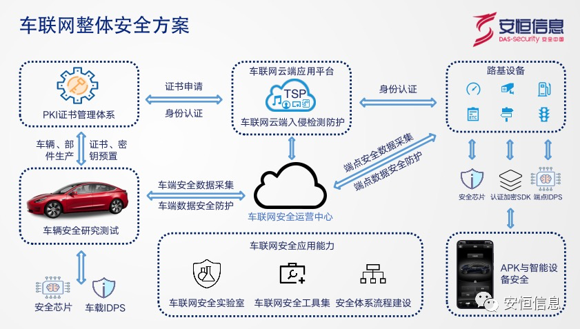 安恒信息车联网综合解决方案包含PKI证书管理体系平台、车辆软件安全开发流程咨询与建设(SDL)、云端安全防护系统建设、车端及车联网业务系统安全渗透测试、车端安全防护产品应用(IDS)与车联网安全运营中心建设(VSOC)、安全芯片应用、车联网安全实验室建设、车联网专有安全测试工具等,为车联网构建了涵盖多种类型网络通信的多级、多域、立体化安全防护体系。