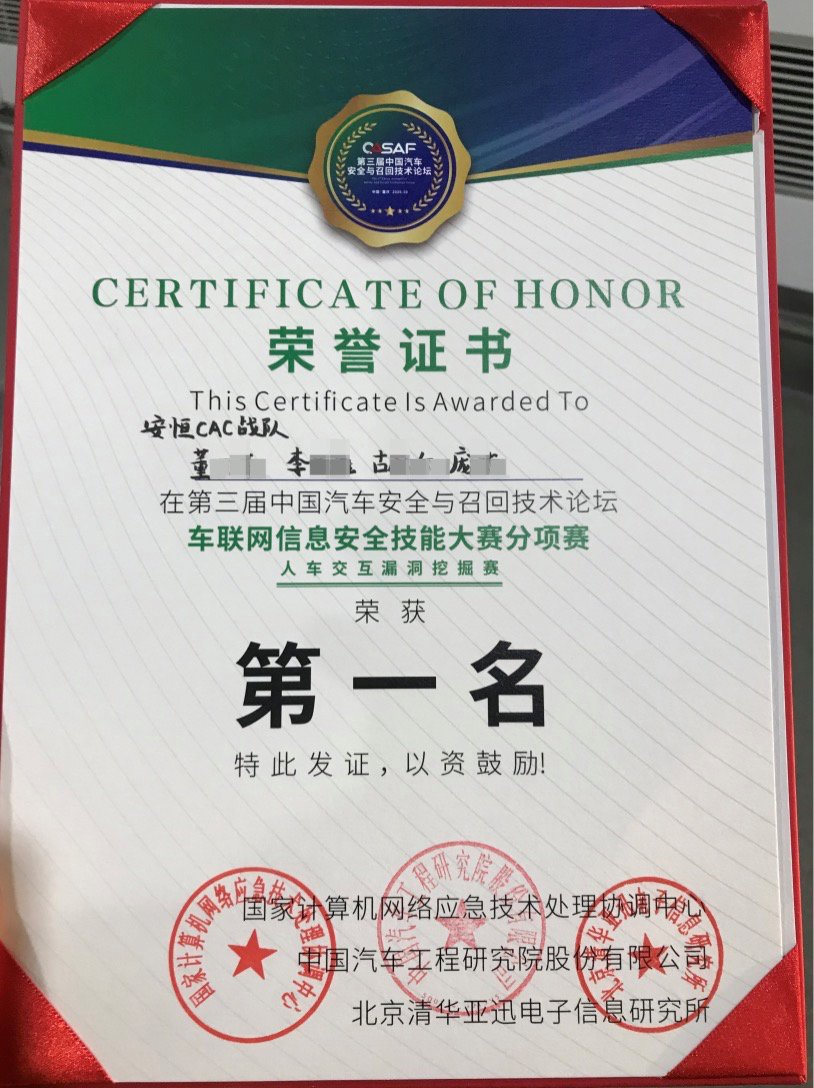 2021年,在中国汽车安全与召回技术论坛车联网安全技能大赛中获得“智能网联汽车破解赛”一等奖