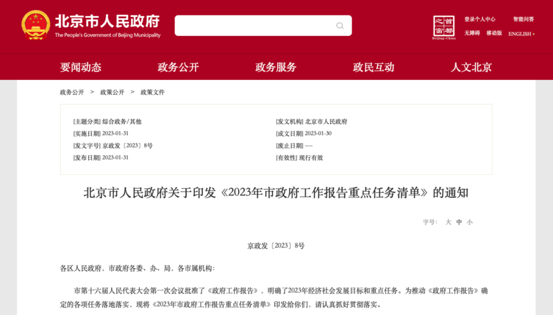 近期,北京市人民政府印发《2023年市政府工作报告重点任务清单》,针对数字经济、科技创新、文化、生态、政府建设等十二个方向,提出了300项重点任务。