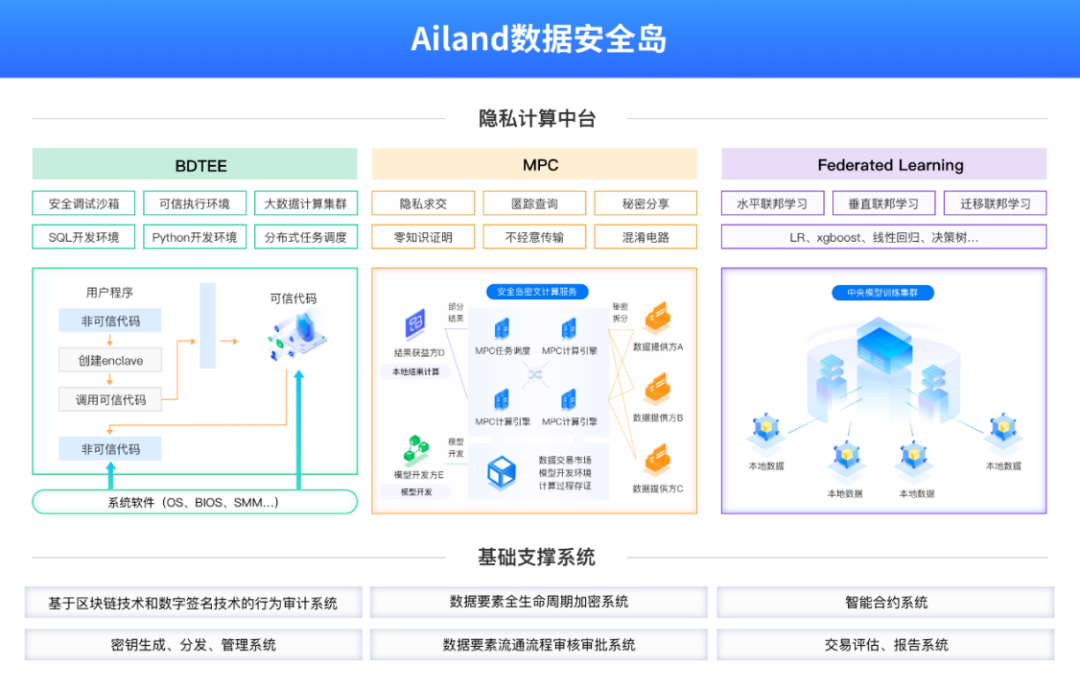 数据要素市场的培育离不开“隐私计算平台”作为其基础设施给予核心技术支持和数据安全保障。AiLand数据安全岛隐私计算平台是一个专注于保障数据安全流通,致力于解决数据共享过程中的安全、信任和隐私保护问题的隐私计算平台。综合应用安全计算沙箱、联邦学习、MPC等多种前沿技术,配合关键行为数字验签和区块链审计技术,实现共享数据的所有权和使用权分离,确保原始数据的“可用不可见”、“可用不可取”,保障多方数据联合计算过程的可靠、可控和可溯。