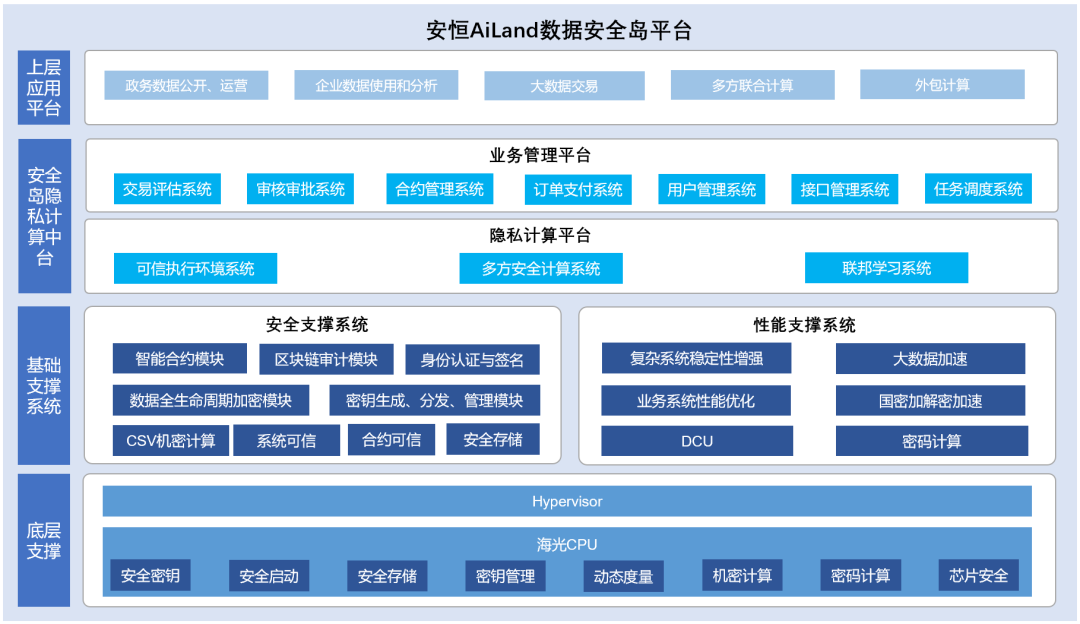 安恒信息AiLand数据安全岛平台作为隐私计算行业的明星产品,是一个专注于保障数据安全流通,致力于解决数据共享过程中的安全、信任和隐私保护问题的平台。从安全性来看,已获公安部颁发的销售许可证、国密资质证书,同时也通过了中国信通院区块链辅助隐私计算基础能力、可信执行环境基础功能专项评测;从系统兼容性来看,通过了海光CPU兼容认证、海光TEE认证、鲲鹏C认证、V认证、TEE认证。从市场认可度来看,目前安恒信息AiLand数据安全岛已在全国多个省市大数据局、公安、金融、医疗行业有标杆案例的落地,并获得鲲鹏大赛数字政府全国赛金奖、入选互联网科技成果展示馆、大数据产业发展试点示范项目名单、浦东人工智能创新大赛-隐私计算、数据安全典型实践案列等。