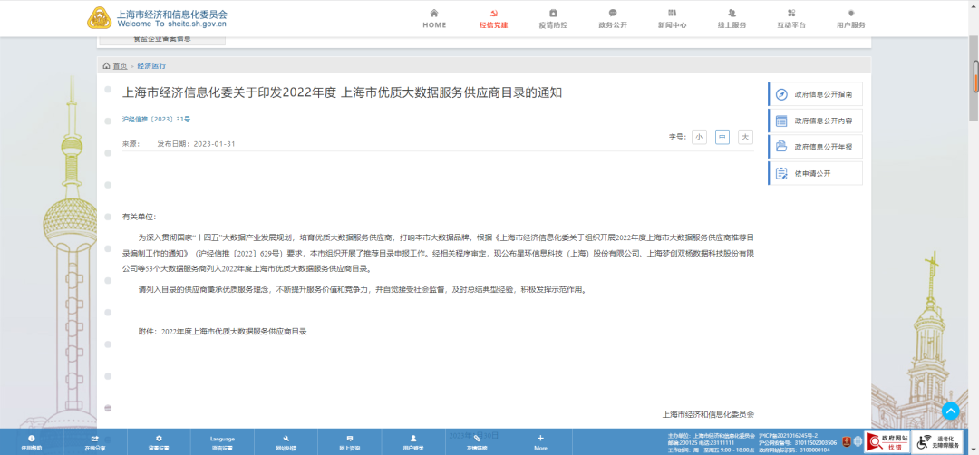 上海市经济信息化委印发《2022年度上海市优质大数据服务供应商目录》通知