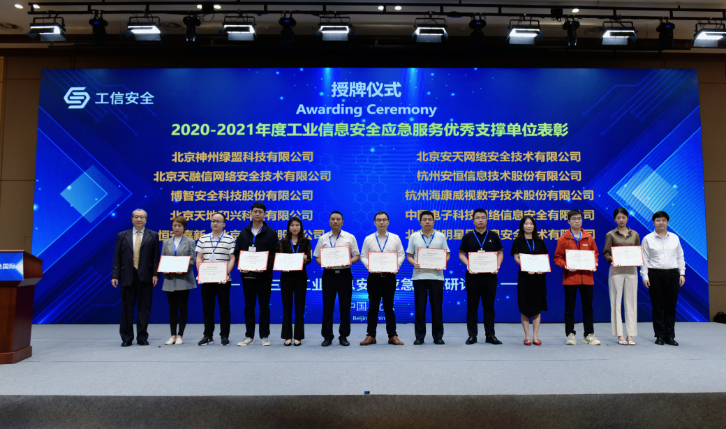 2020-2021年度工业信息安全应急服务优秀支撑单位(左五为安恒信息)