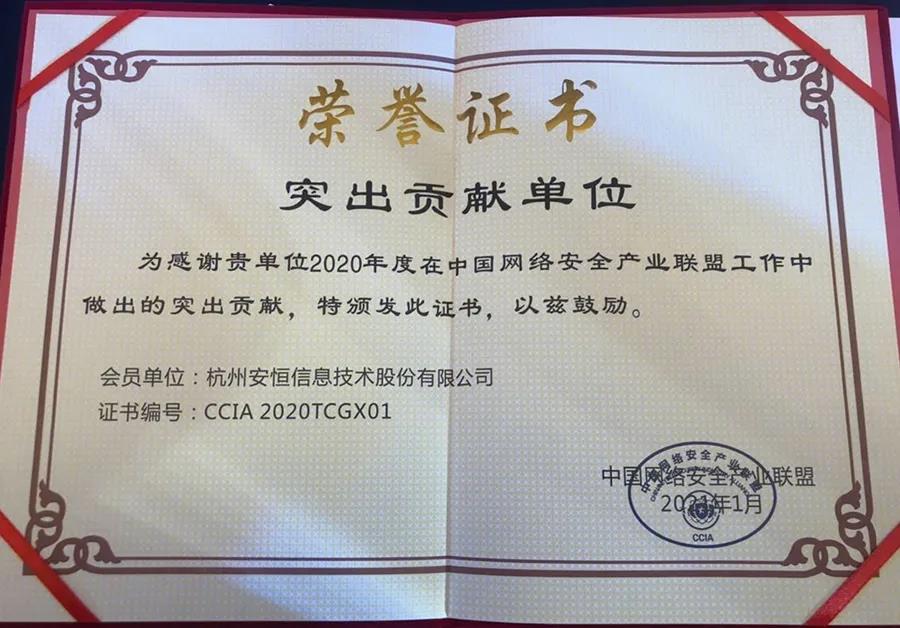在2020年,安恒信息参与了中国网络安全产业联盟(CCIA)组织开展的“2020年优秀网络安全解决方案和网络安全创新产品评选活动”。经联盟评审公示,安恒信息荣获“2020年网络安全解决方案优秀奖”(智能制造企业工业互联网平台安全防护建设方案)和“2020年网络安全创新产品优秀奖”(天池云安全管理平台),成为极少数获得双料奖的安全企业之一。