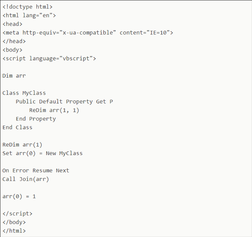 尽管微软已经在2019年8月的IE更新中全面禁用了vbscript,但出于安全性考虑,完整利用代码不予公开。
