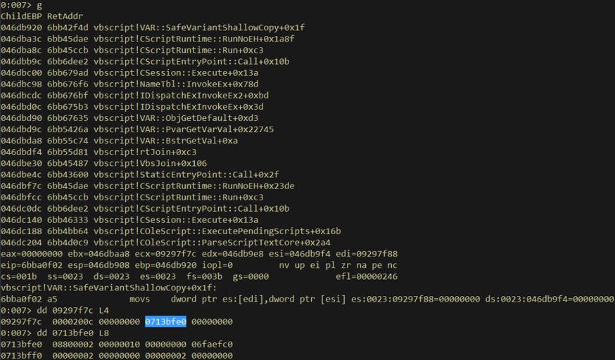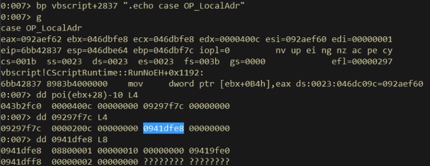 在前面的基础上,就可以泄露一个指针对象以绕过ASLR,这里笔者采用的方法和和CVE-2019-0752一样,泄露一个Scripting.Dictionary对象的虚表指针,具体操作如下: