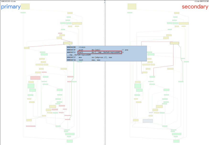 清楚漏洞成因后,人生就是搏z6尊龙来看一下微软在9月更新中是如何修复该漏洞的。笔者用Bidiff工具比对了8月更新和9月更新两个vbscript.dll,发现在rtJoin(rtFilter均类似,下面只以rtJoin进行说明)函数中,在对数组内的元素进行操作前后,加了一对SafeArrayLock/SafeArrayUnlock函数: