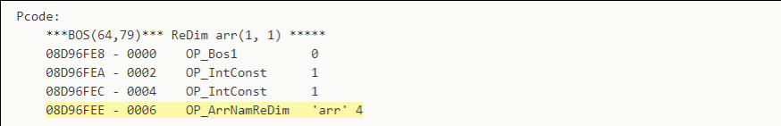 这里再引述一下上面提到的P-Code,可以看到ReDim arr(1, 1)这句语句对应的P-Code如下: