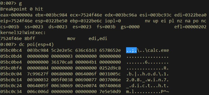 这里提一个笔者编写利用时遇到的问题,笔者一开始是在windows7 sp1 x86环境下写的利用,代码全部写完后发现计算器无法弹出,一番调试后发现,传入WinExec函数的命令行参数无法得到正常解释,原因也很简单,来看一下某次win7调试时最终传给WinExec的参数: