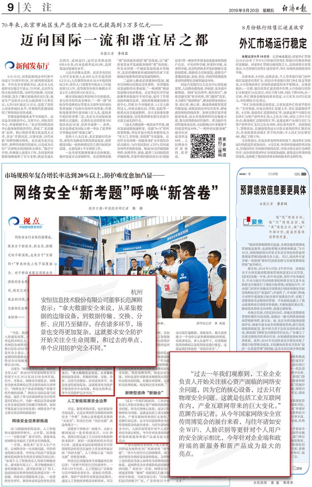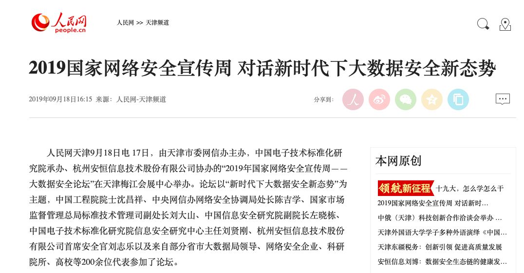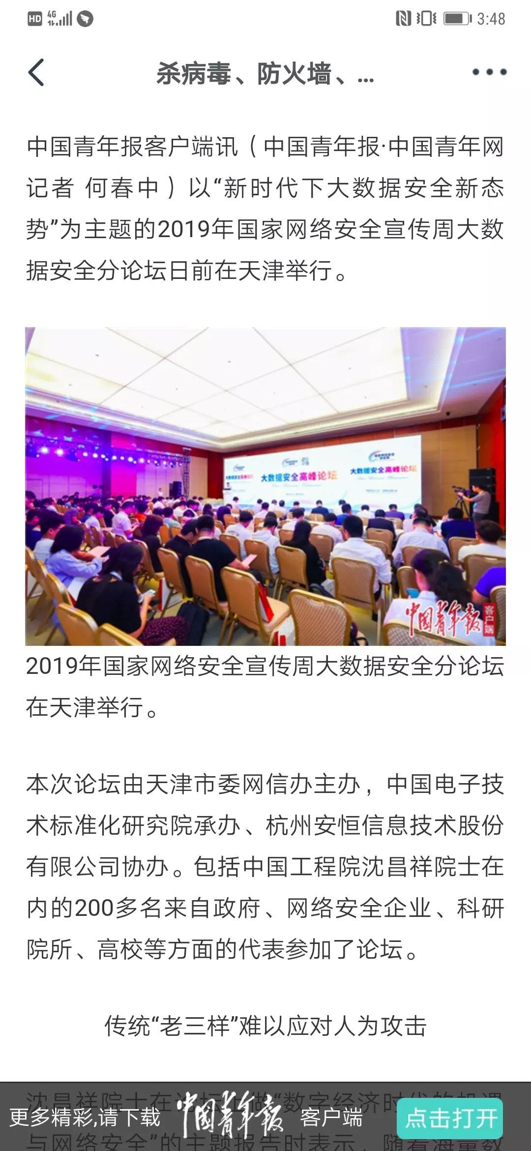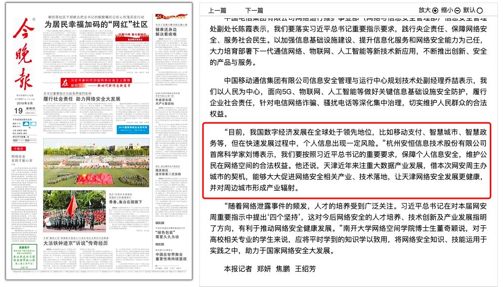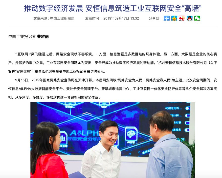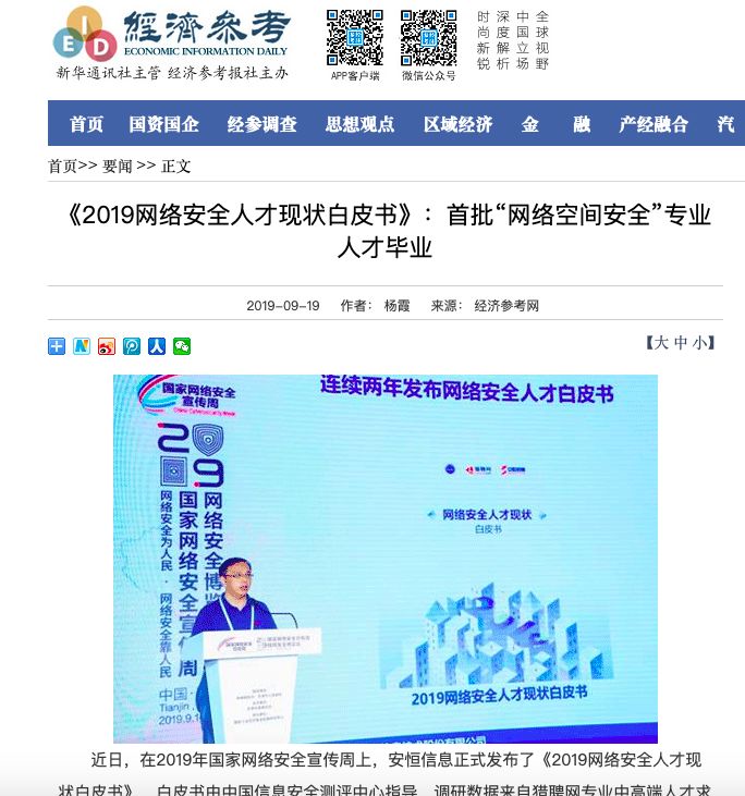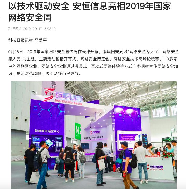 今年,安恒信息通过互动式体验、漫画等方式展现网络安全体系,协办大数据安全论坛,联合发布《2019网络安全人才现状白皮书》,多维度参与到国家网络安全周,也多次出现在诸多媒体的镜头和笔触下!