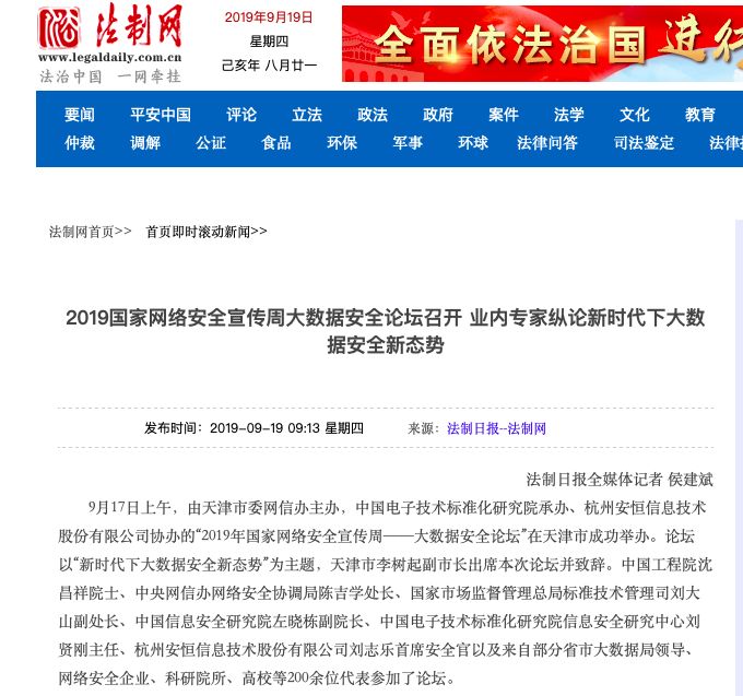 作为安全周重要的分论坛之一,9月17日举行的“大数据安全论坛”邀请了党政机关领导、国内知名专家学者、各省市大数据局代表等,对话“新时代下大数据安全新态势”。人民网、中国经济网、中国青年报、法制网等纷纷做了报道。