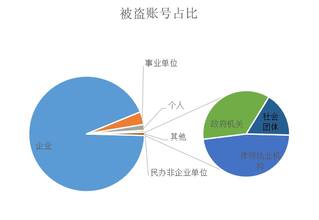 不法分子邮件攻击账号的来源可能自己搭建节点,也可能是通过盗号的方式获取的原本正常的账号。选取其中可以识别到单位的攻击账号,可以清楚的发现企业是账号被盗的重灾区,被盗账号占比高达93.4%,其次部分的事业单位也存在对应的风险,约占整体被盗账号的3.6%,再就是个人的邮箱账号占比1.7%,如图5所示。