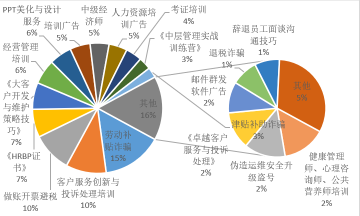 攻击者以牟利为主要的目的,通常会实施培训广告和金融诈骗两种类型的邮件攻击。针对邮件的主题进行分析后,发现《关于发放员工补助(补贴)福利通知》、《个人劳动(补贴))已下发,请查看下图查收》这类劳动补贴类的诈骗邮件占比高达15%,其次是各类培训,以企业经营管理类培训为主,包含客服类、经营管理类、人力资源、销售类、 财务避税等针对企业的各类培训,整体高达40%,也有PPT美化,中级经济师等各类针对个人的培训约占20%。同时也会有开票避税这类黑灰色产业信息,也有直接卖邮件群发软件这类工具的邮件,如图7所示。