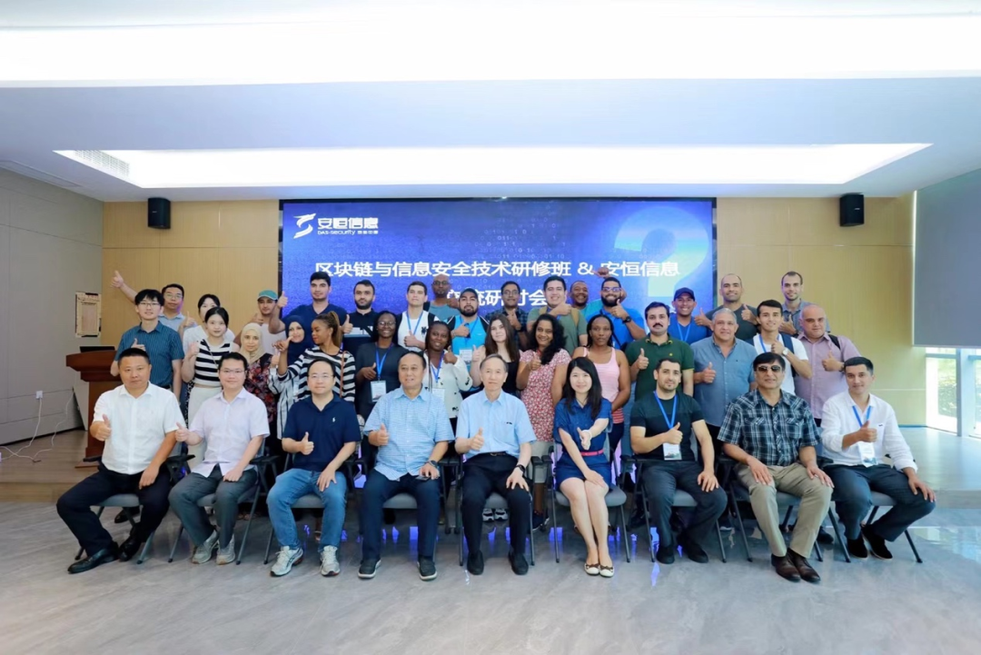 近日,区块链与信息安全技术交流研讨会在安恒信息西部总部成功举办。本次活动是商务部区块链与信息安全技术研修班项目活动组成部分,由上海亚太地区经济和信息化培训中心承办,在成都市大数据协会支持下,来自阿塞拜疆、古巴、加纳等11个国家28名代表,成都市大数据协会常务会长李跃, 上海亚太地区经济和信息化培训中心主任王根祥,安恒信息高级副总裁吴永越、段平霞,安恒信息四川分公司总经理、成都安恒信息公司总经理岳华龙出席会议。会议围绕安恒信息在网络安全领域的成果以及区块链安全相关技术创新进行深入探讨。