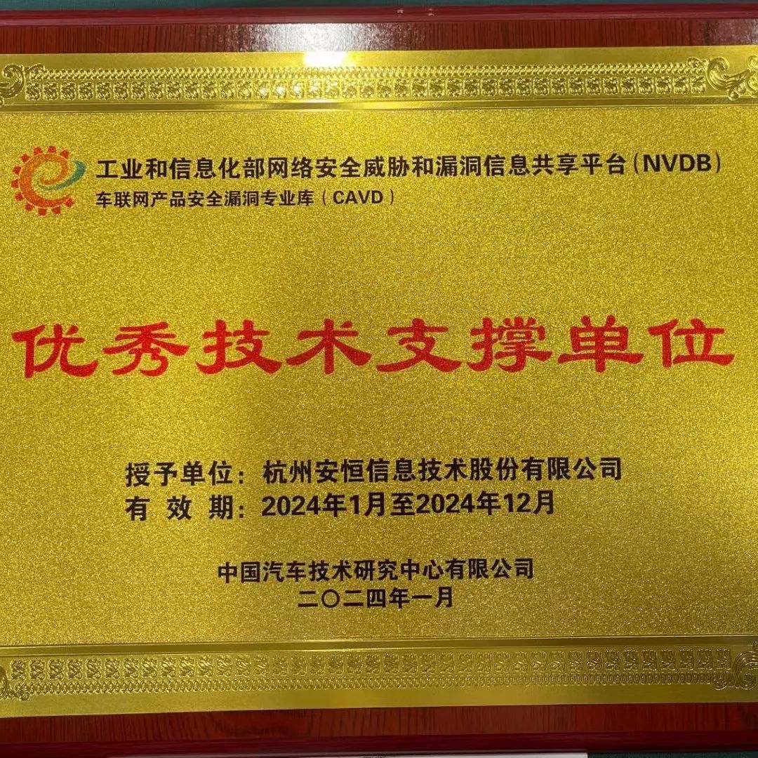 安恒信息获颁工信部车联网产品安全漏洞专业库优秀技术支撑单位