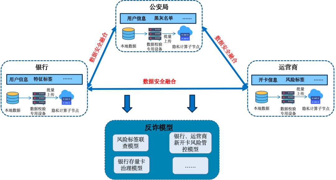 通过数据安全岛隐私计算平台中完全去中心化的多方安全计算技术,让公安、银行以及运营商的原始数据在不出本地的前提下,安全合规地共享融合。在保护所有参与方数据的前提下,实现数据可用不可见,最终完成反诈模型的计算,让百姓的生命财产不受侵犯。