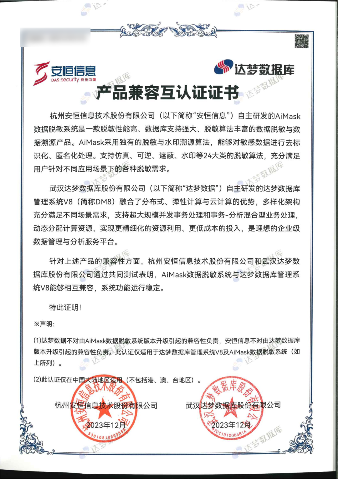 ➣达梦产品兼容性认证证书