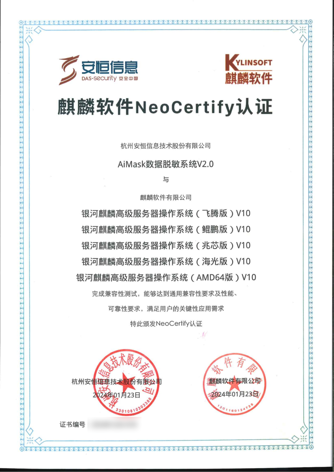 ➣银河麒麟产品兼容性认证证书