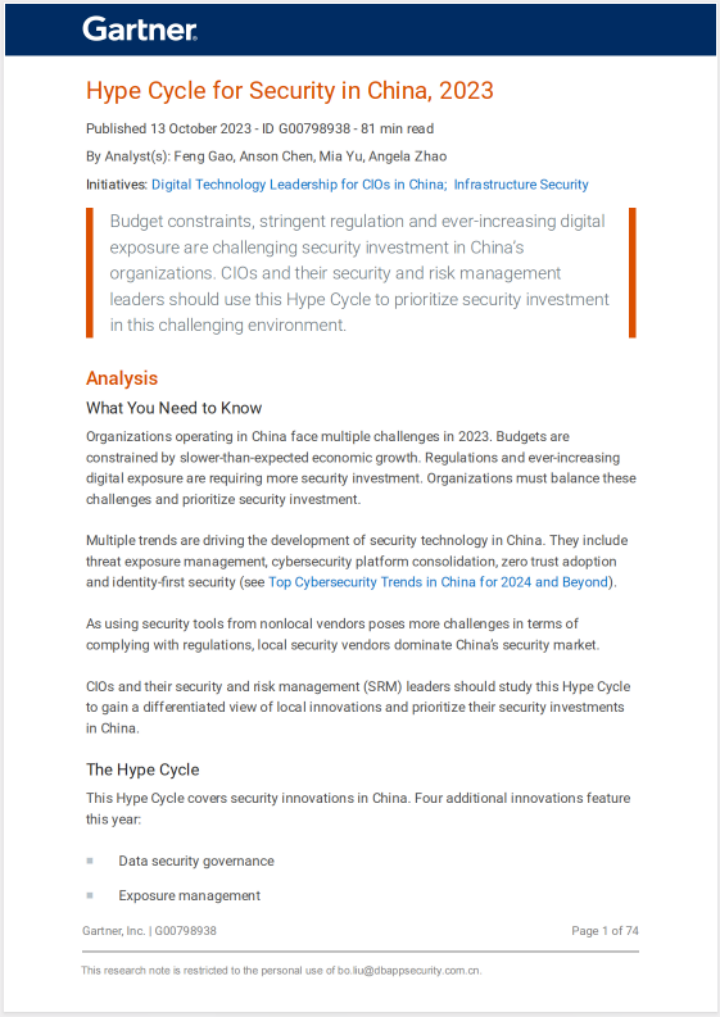 国际权威研究机构Gartner正式发布《2023中国网络安全技术成熟度曲线(Hype Cycle for Security in China, 2023)》报告。安恒信息被列为数据安全平台、CPS安全、云安全资源库、软件成分分析、数据分类、攻防对抗六大领域标杆供应商。