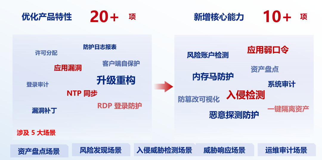 安恒EDR作为数字资产守门人的重要代表,在过去的一年当中,结合实战工作场景,优化了应用补丁、RDP登录防护等20余项产品特性,新增了风险账户检测、恶意探测防护、内存马防护等10多余安全能力,全面适用于实网攻防对抗和高级威胁检测等场景。