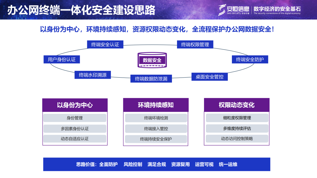 2023年11月,在世界互联网大会期间,安恒信息终端安全提出办公网一体化方案,产品以“身份为中心,环境持续感知,资源权限动态变化,全流程保护办公网数据安全”为愿景,为用户提供上网准入、病毒查杀、数据防泄漏、桌面管理、上网行为管理等能力价值,确保用户在安全的终端网络环境下进行办公,让网络世界更安全的连接,是安恒信息终端安全的下一站。
