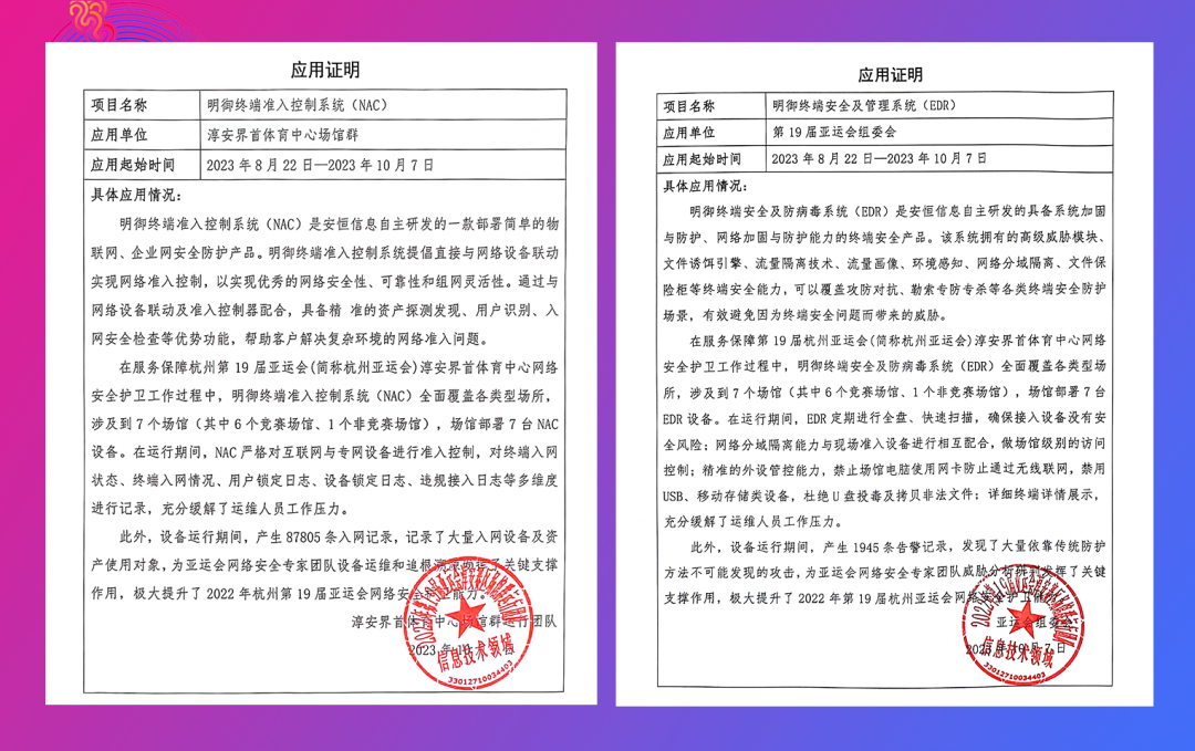安恒信息作为杭州亚运会官方网络安全服务合作伙伴,在赛事网络安保过程中,安恒EDR以及安恒终端准入为数万亚运终端提供可靠保障,并凭借其优异表现获得了亚组委的官方认可。